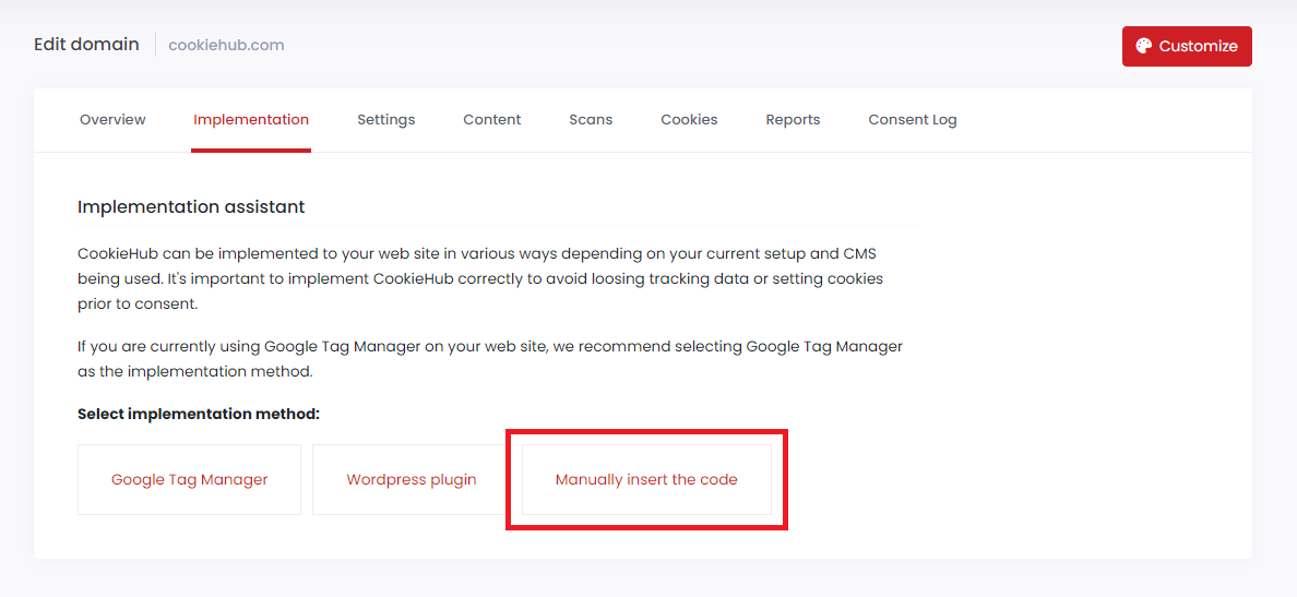You need your implementation code to install CookieHub on your website. This code is unique to each domain and is referenced in all setup guides.