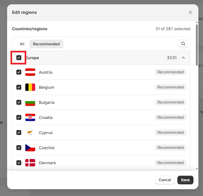 Select all countries where you want the CookieHub dialog displayed. This list should match the regions configured in your CookieHub dashboard.