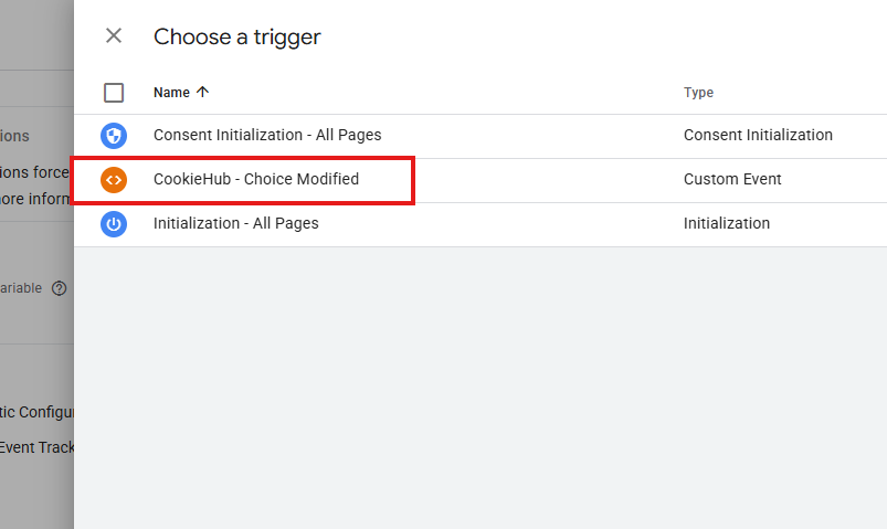 If you installed the CookieHub GTM community template, you need to manually create the CookieHub – Choice Modified trigger for tags that require additional consent. If it already exists, you can skip these steps.