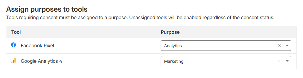 - Assign the appropriate purposes to each tool that depends on consent (Analytics, Marketing, etc.).