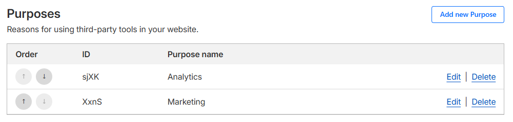 Write down the Purpose IDs — you will need them later when connecting CookieHub.
